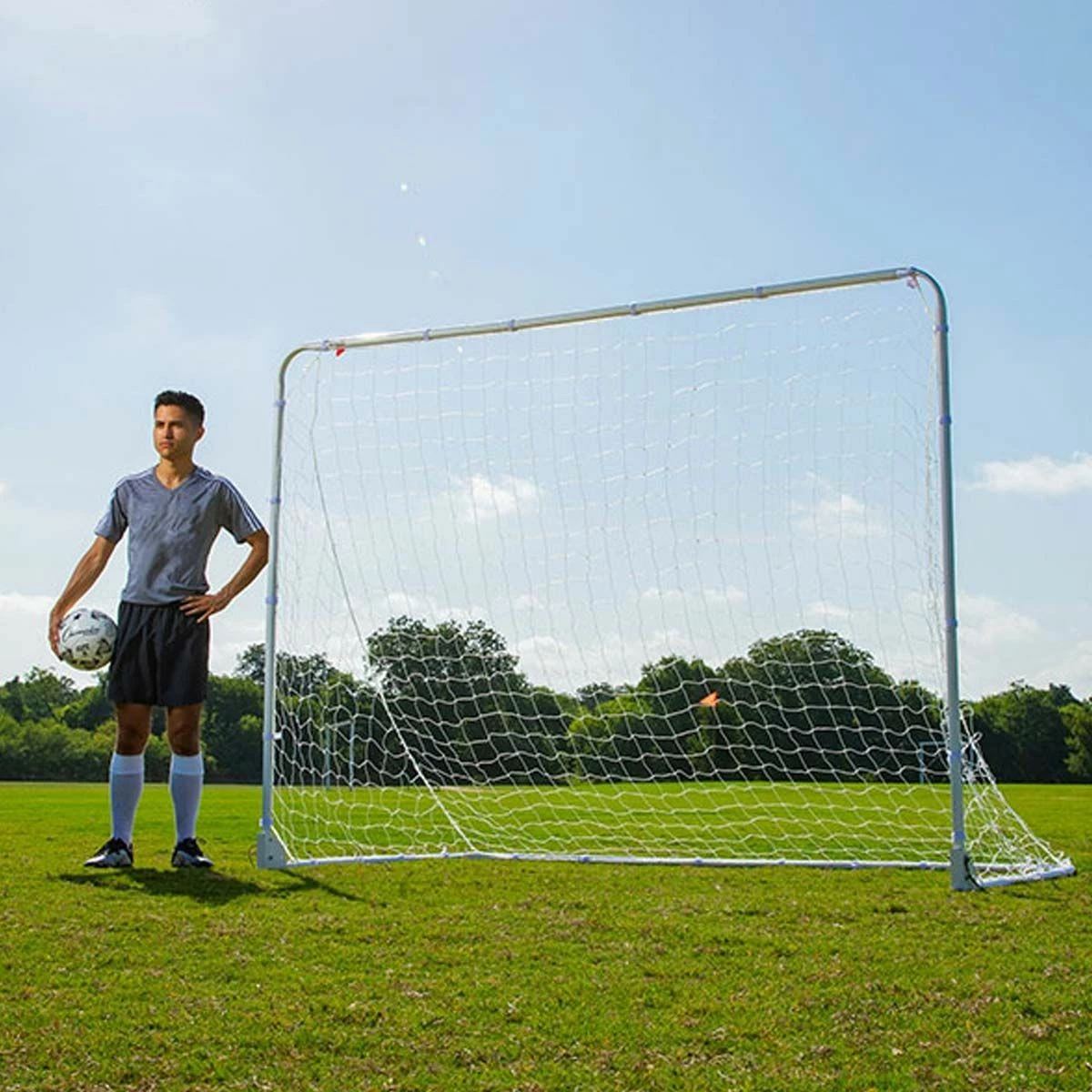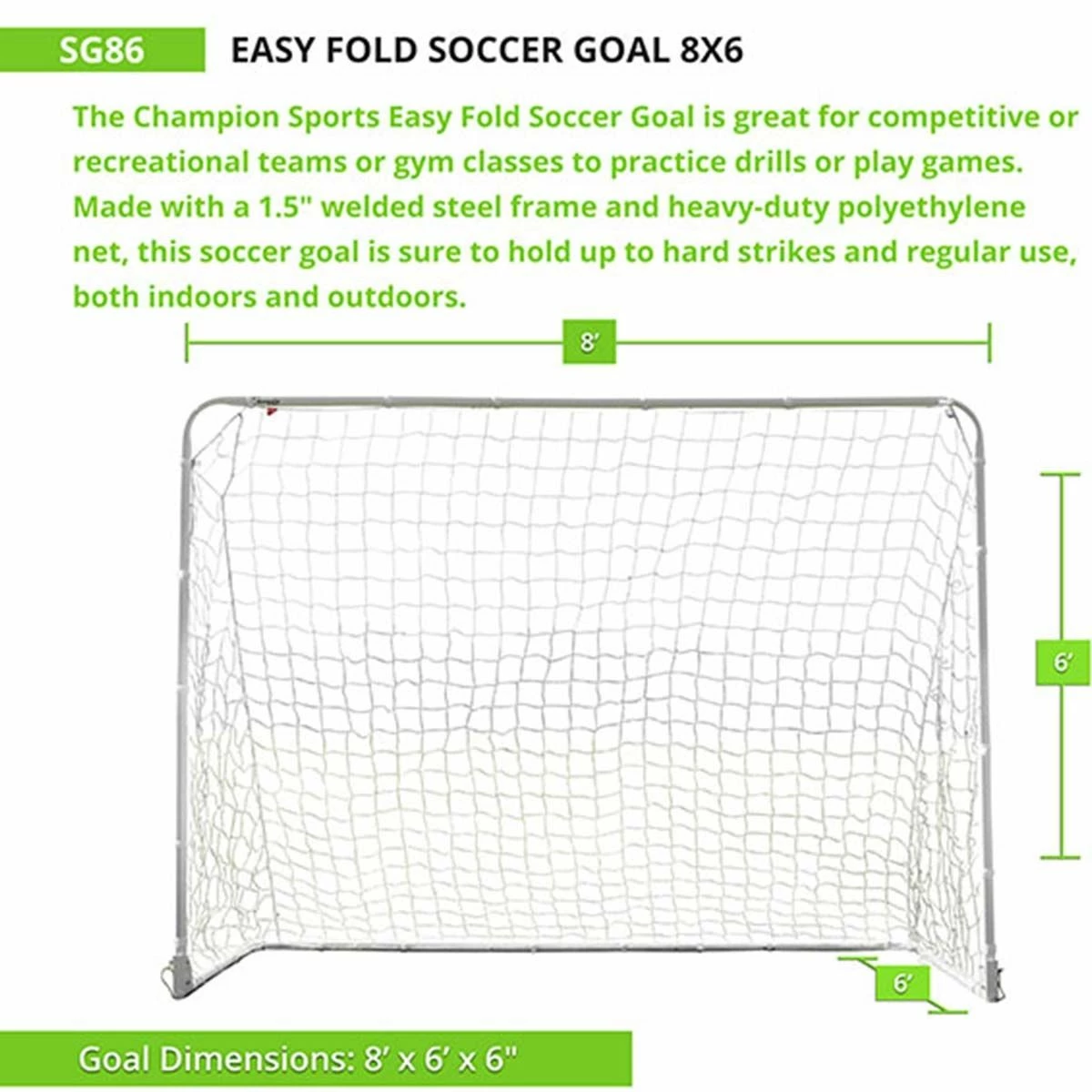Hone in on your skills with this 6′ x 8′ folding soccer goal from Champion. This soccer training goal has a hinge pin-lock system which allows you to transport and store easily. This unique soccer goal has a 1.5″ welded steel frame for easy and convenient transportation and storage. The goal includes a heavy-duty polyethylene net with Velcro® corner loops to allow you to set up very easily.