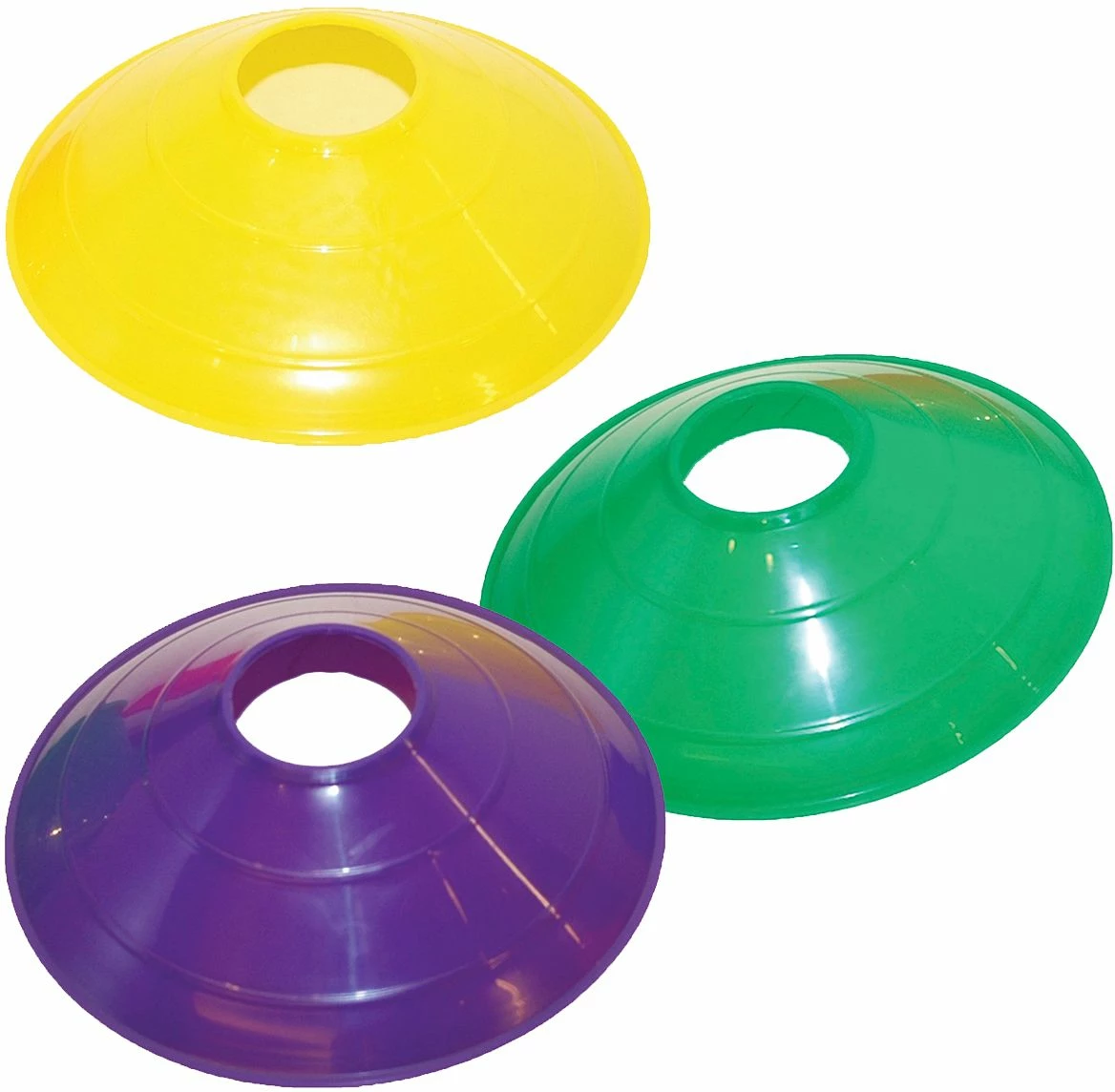 These flexible and colorful disc cones are ideal for field marking, games and any sport-related drills. Saucer shape makes these cones resistant to heavy winds and blowing over. Soft, safe and flexible construction.