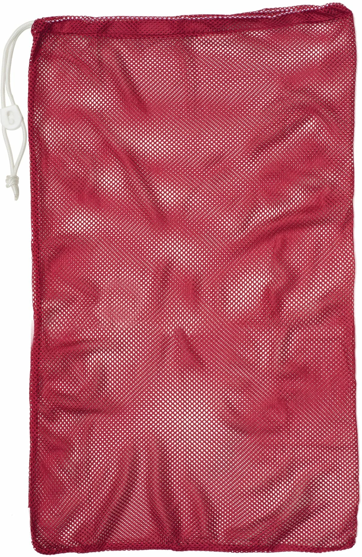 This Champion Sports equipment bag features red colored tight nylon mesh that can hold six balls and other equipment. For easy closure, the bag includes a drawstring.