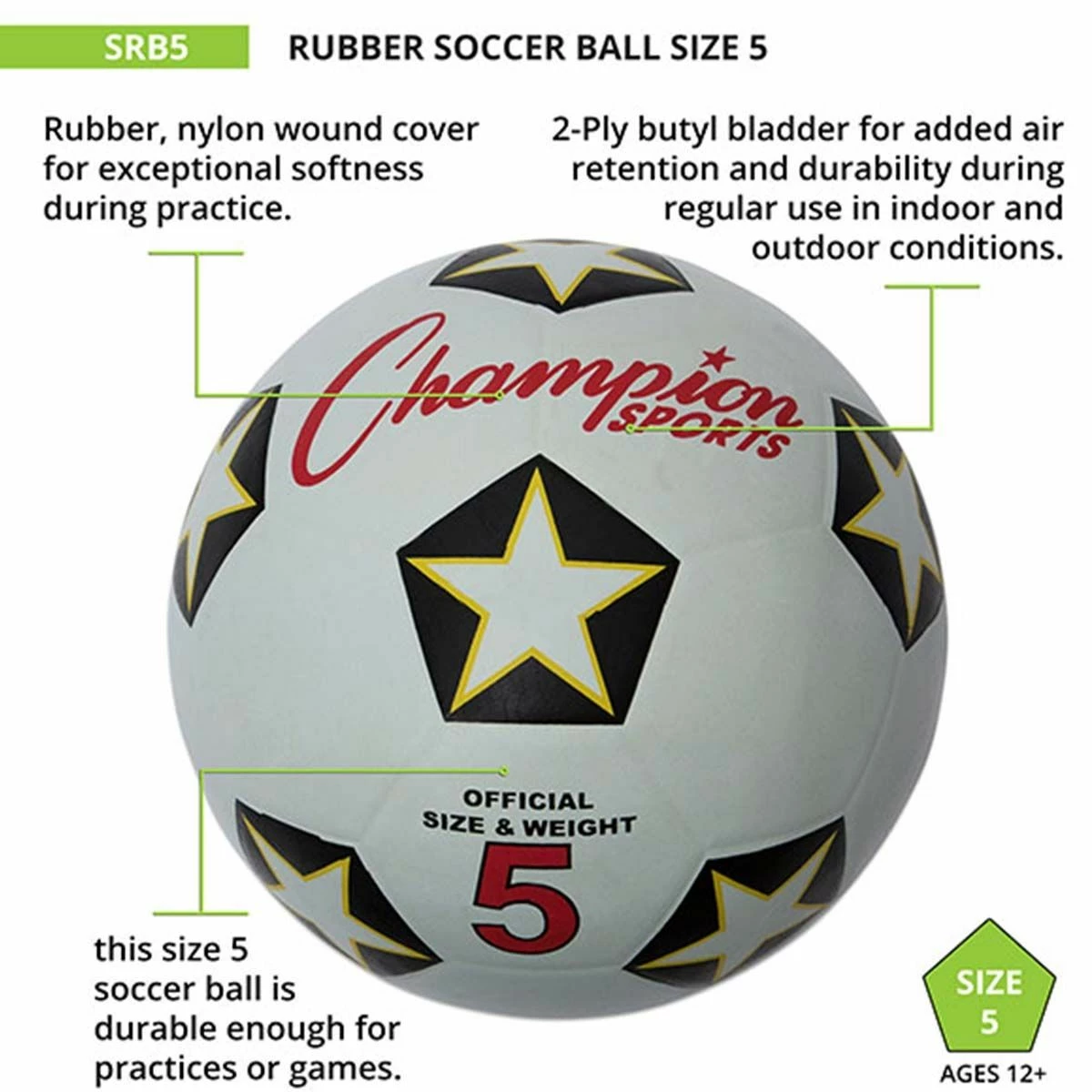 The rubber soccer ball from Champion Sports is perfect for gym classes, indoor recreational leagues, and camps. This soccer ball is equipped with a rubber, nylon-wound cover that is designed to maintain its shape. The 2-ply bladder provides exceptional air retention for less inflating and more playing on indoor or outdoor surfaces. You can get this ball in size 3, 4, or 5. Sizes 4 & 5 are recommended for ages 12 and up, while the size 3 ball is recommended for ages 8 and under.