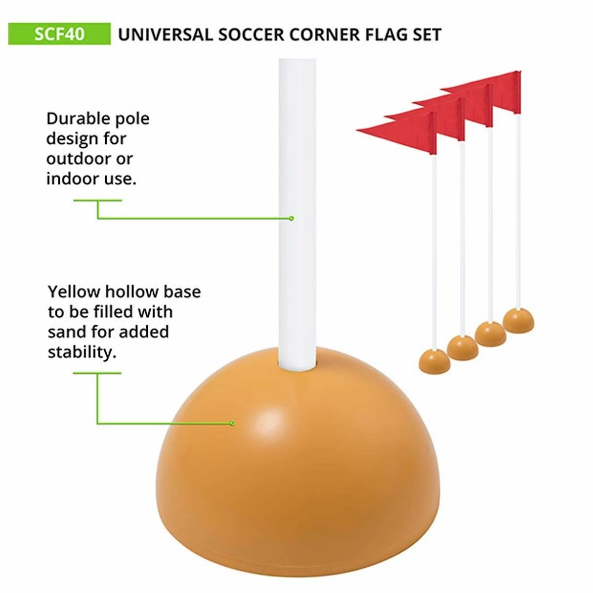 These universal corner flags can be used indoors and out on grass or turf fields. Each set includes 4 corner flags on a 1″ O.D. tube with a plastic yellow base that is filled in the field with sand.Â