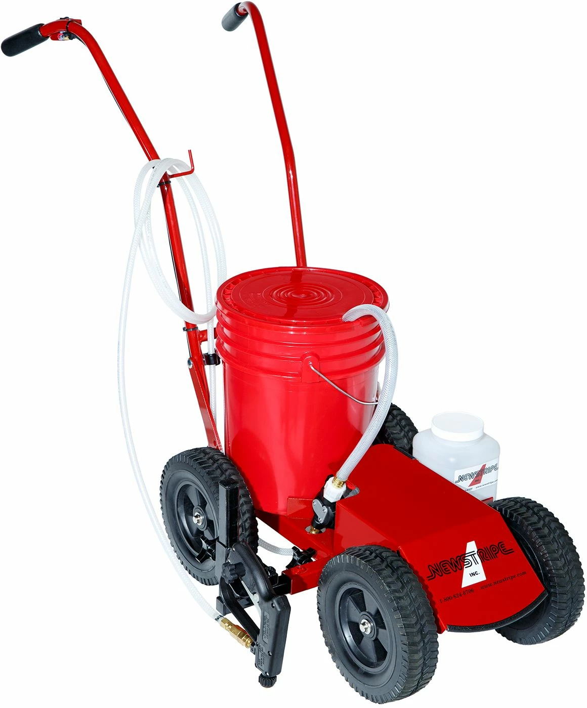 The Eco-Liner Plus is a battery powered field striping machine that features a heavy duty diaphragm pump that is powered by a 12-volt deep cycle battery. The Plus model includes a rapid charging 120V plug in battery charger. This time-saving addition adds to the performance and flexibility of the Eco-Liner. Additionally, the Plus features hand operated, handle mounted spray controls with quick release clamp that allows you to remove the spray gun for effortless painting of stencils with a 12′ hose.This walk behind striper features dual handles with cushioned grips. You can quickly and easily paint professional quality lines for hours on a single battery charge. Now you can avoid the expensive maintenance of a gasoline engine or compressor. The Eco-Liner is proudly made in the USA with all welded steel construction and quality components giving you the trusted quality and durability that you deserve. The machine is easy to use with no messy pouring, simply place a 5-gallon pail of premixed paint on the machine. Changing colors is fast and easy with the operator friendly design. There are no high pressure systems to work with making operation completely safe. When you’re done, simply flush clean water through the spraying system and the machine is ready for your next field marking job. The efficient spray nozzle paints fields in half the time because there is no need to touch up or repaint for visibility. The line width is fully adjustable from 2″- 6″ allowing for greater flexibility. The four no-flat tires never need inflating and have a knobby tread that can meet the demands of any terrain. The intake hose has a large mesh filter and features an additional inline filter with check valve to eliminate clogged tips and messy dripping. The filters and tips can be easily cleaned in under 30 seconds. An onboard clean water reservoir allows you to clean on-site.