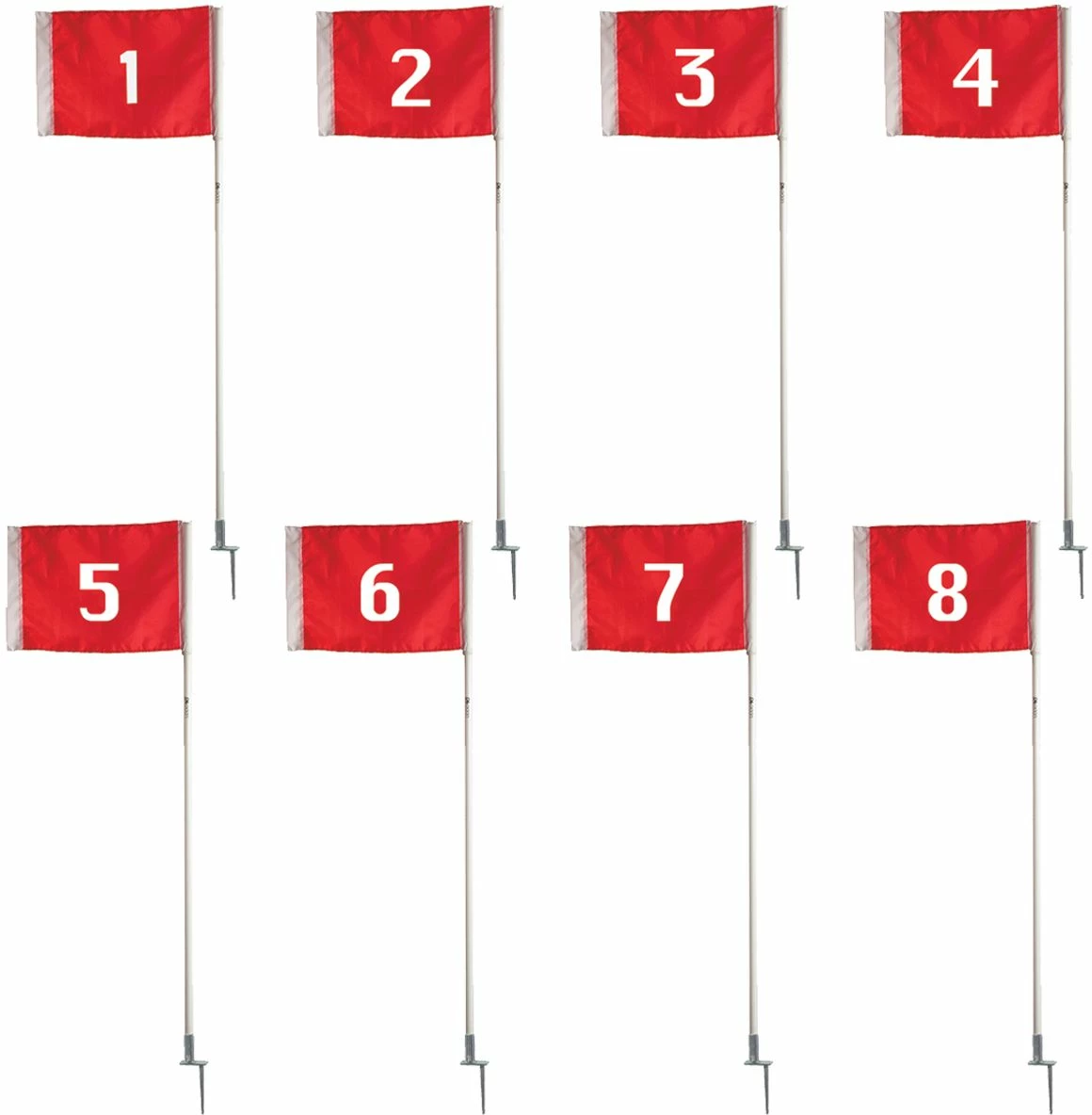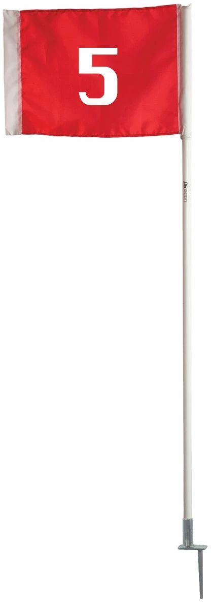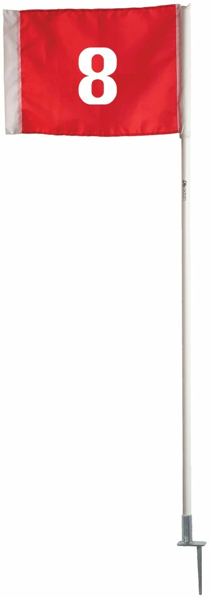 This versatile numbered set of 8 flags can be used to mark the field or run drills. Designed for outdoor use, each flag has a steel peg to keep it firmly in place. The support tube is constructed of 1″ thick PVC plastic.Each stands at 5ft tall with highly visible numbers.