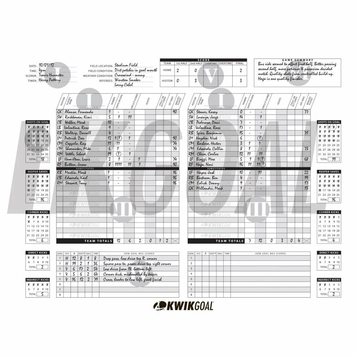 Keep your team organized with Kwik Goal’s Oversized Scorebook. This oversized scorebook is loaded with a team schedule page, game score sheets, player stats and field diagrams for a visual aid at practice or on the sidelines.