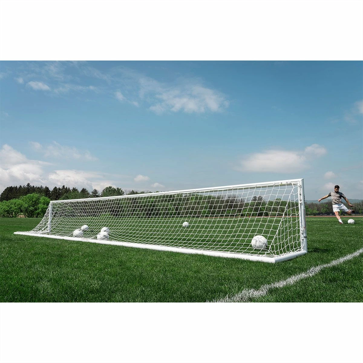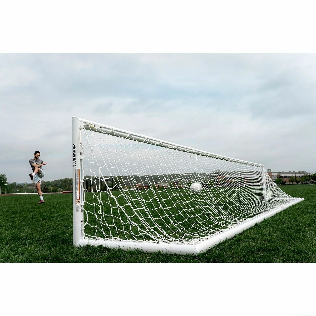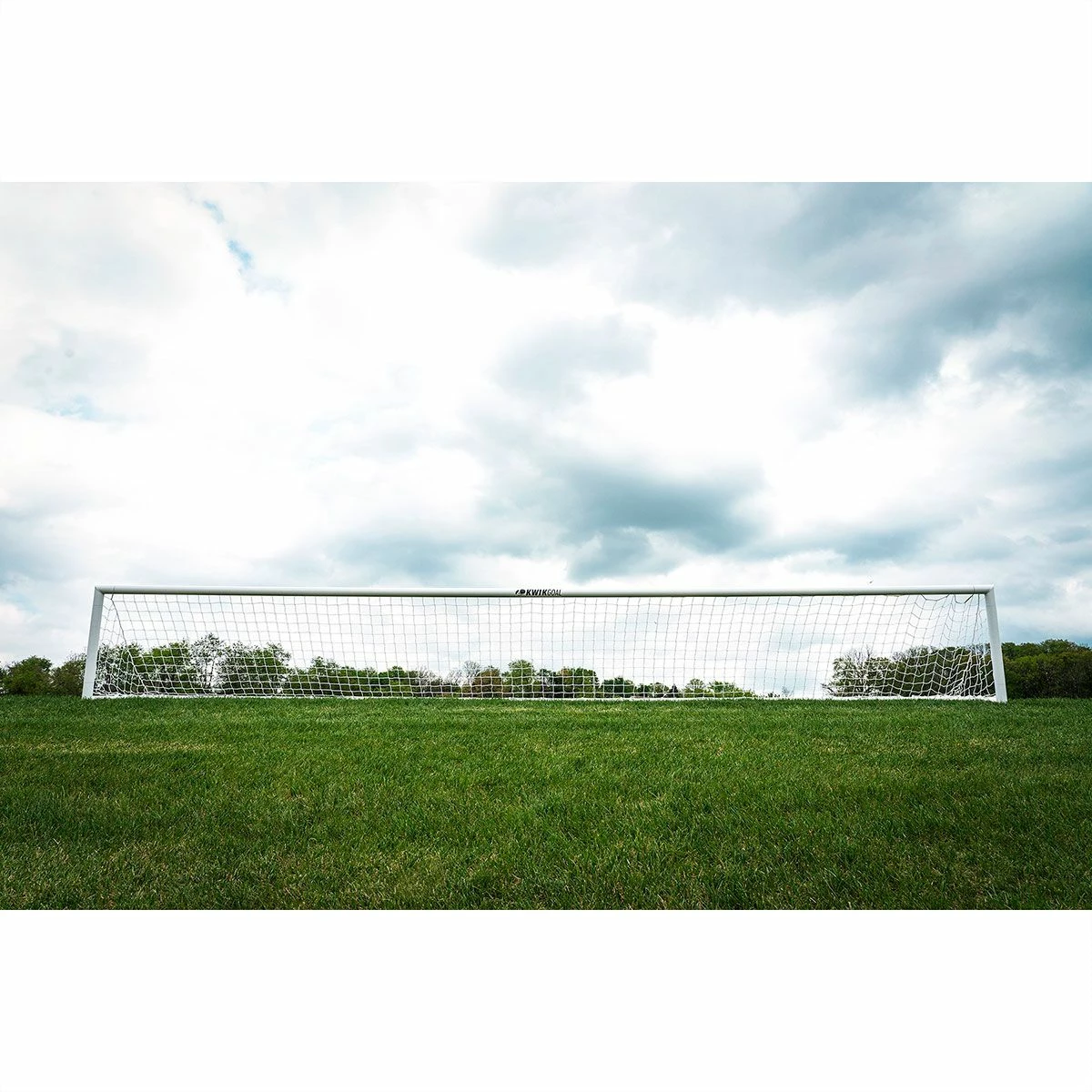 Kwik Goal’s finishing goal is the perfect tool for teaching players how to keep their strikes low and accurate. The Finishing Goal is ideal for shooting drills with a goalkeeper, emphasizing the deadly strike to the bottom corners. This 3′ x 24′ goal has a depth of 3 feet and 3 inches and sports 3″ round all-aluminum posts with a powder coated white finish. The goal features a Kwik Lock® net system and includes a 3mm 3-1/2” mesh white net, net clips, and 4 portable “J” anchors. For an emphasis on striking the ball into the bottom corners of the net, the Kwik Goal finishing goal is an ideal training tool for improving your finishing skills.