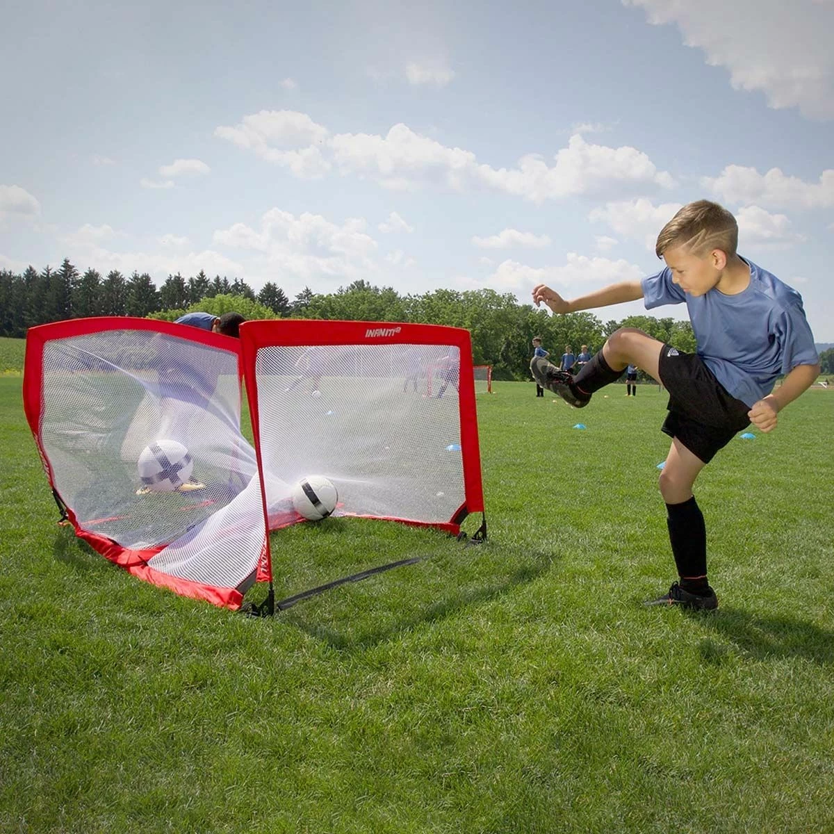 The Kwik Goal Infinity 2 pop-up goal quickly pops up for practice and folds easily for transport and storage. Great for pick-up games and scrimmages at home or set up for a variety of drills on the practice field. Lightweight and easy to carry, the poly/steel frame with gusseted nylon corners folds and stores in its own carry bag. Includes a polyester carry bag, 3 nylon anchor pegs per goal and a polyester net that is 15mm mesh. The Infinity Squared Pop-up Soccer Goal is the official squared pop-up goal of U.S. Youth Soccer.