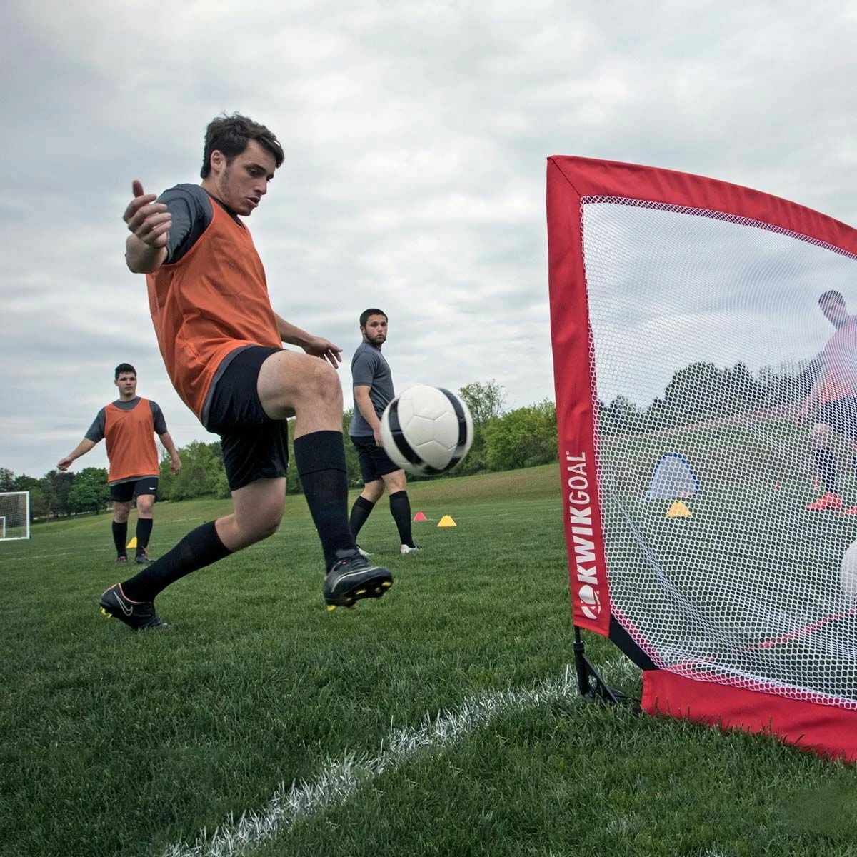 The Kwik Goal Infinity 2 Weighted Pop-up Goal has a weighted base making it ideal for use on grass, turf, the gym or any surface where anchors cannot be used. The goal quickly pops up and folds easily for transport and storage. Great for pick-up games and scrimmages at home or the practice field. Lightweight and easy to carry, the poly/steel frame with gusseted nylon corners folds and stores in its own carry bag. Includes a polyester carry bag, 3 nylon anchor pegs per goal and a polyester net that is 15mm mesh. The Infinity Squared Pop-up Soccer Goal is the official squared pop-up goal of U.S. Youth Soccer.