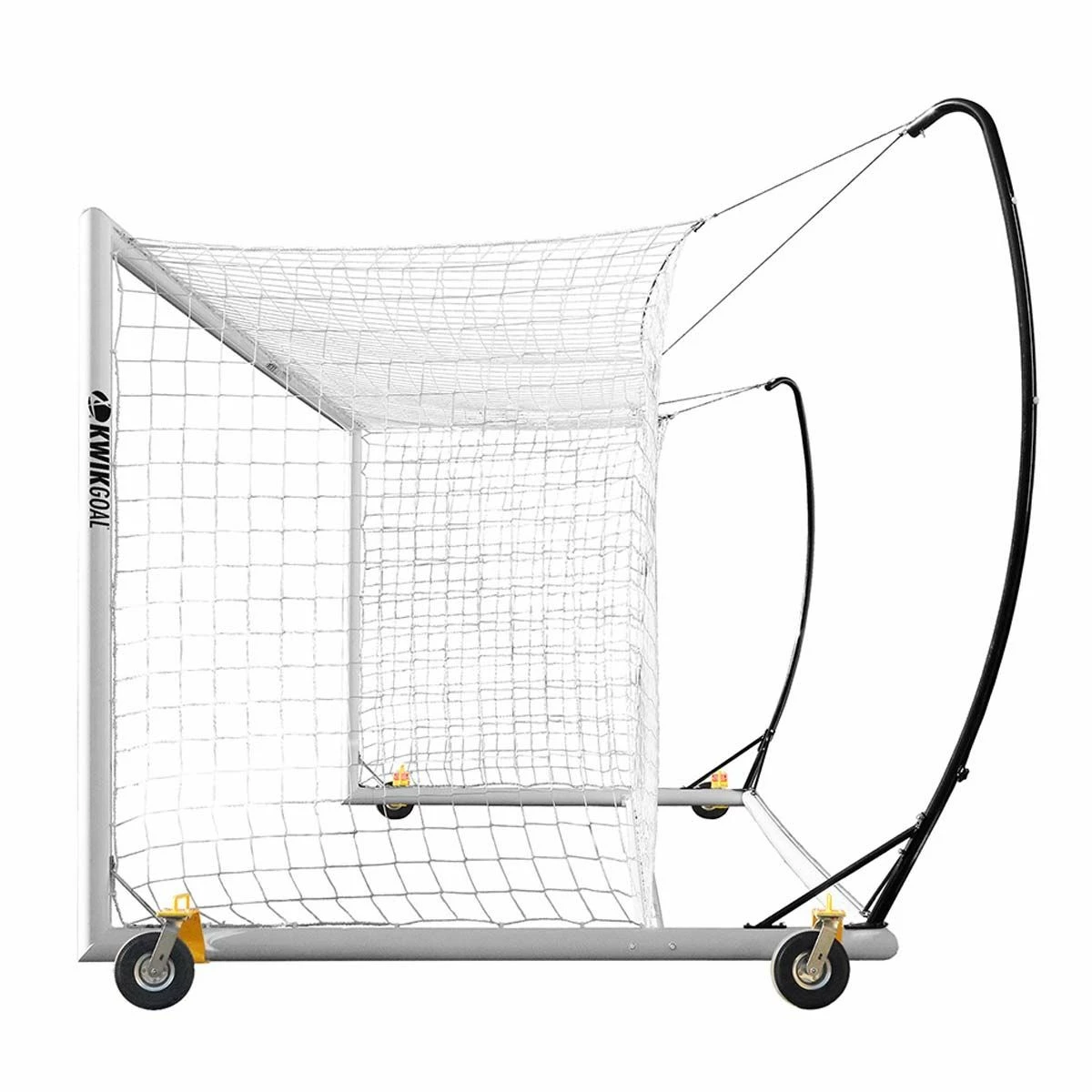 The Kwik Goal Pro Premier® portable competition goal features a 4 3/8” aluminum round post/crossbar and removable swivel wheels making the goal easy to maneuver on the field. The portable design is ideal for the facility that wants an international goal look but cannot sink ground sleeves into the field. The Pro Premier® features a durable all-aluminum base-frame with a knob tension system on the back posts that allows the goal to maintain its shape. This goal ships complete with 6 saddle anchor bags and 4 semi-permanent ground anchors, keeping the goal secure on the turf. A set of Kwik Lock® net clips is also included to keep the net in place. This pro premier® portable competition goal meets the ASTM safety standard F2950-14 for soccer goals. Get it for your soccer facility today!