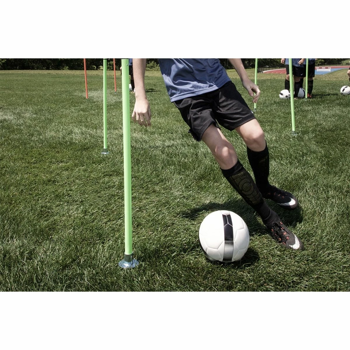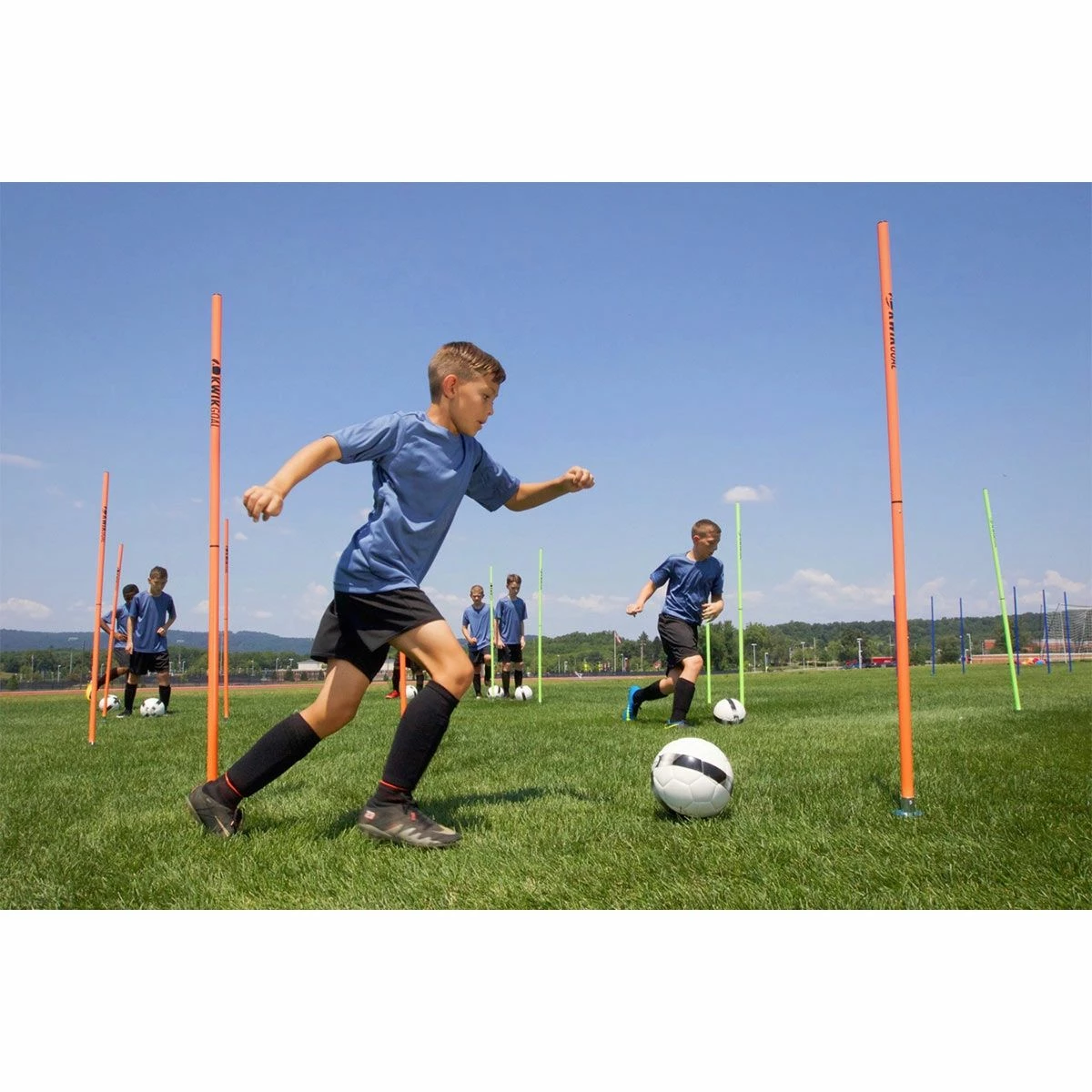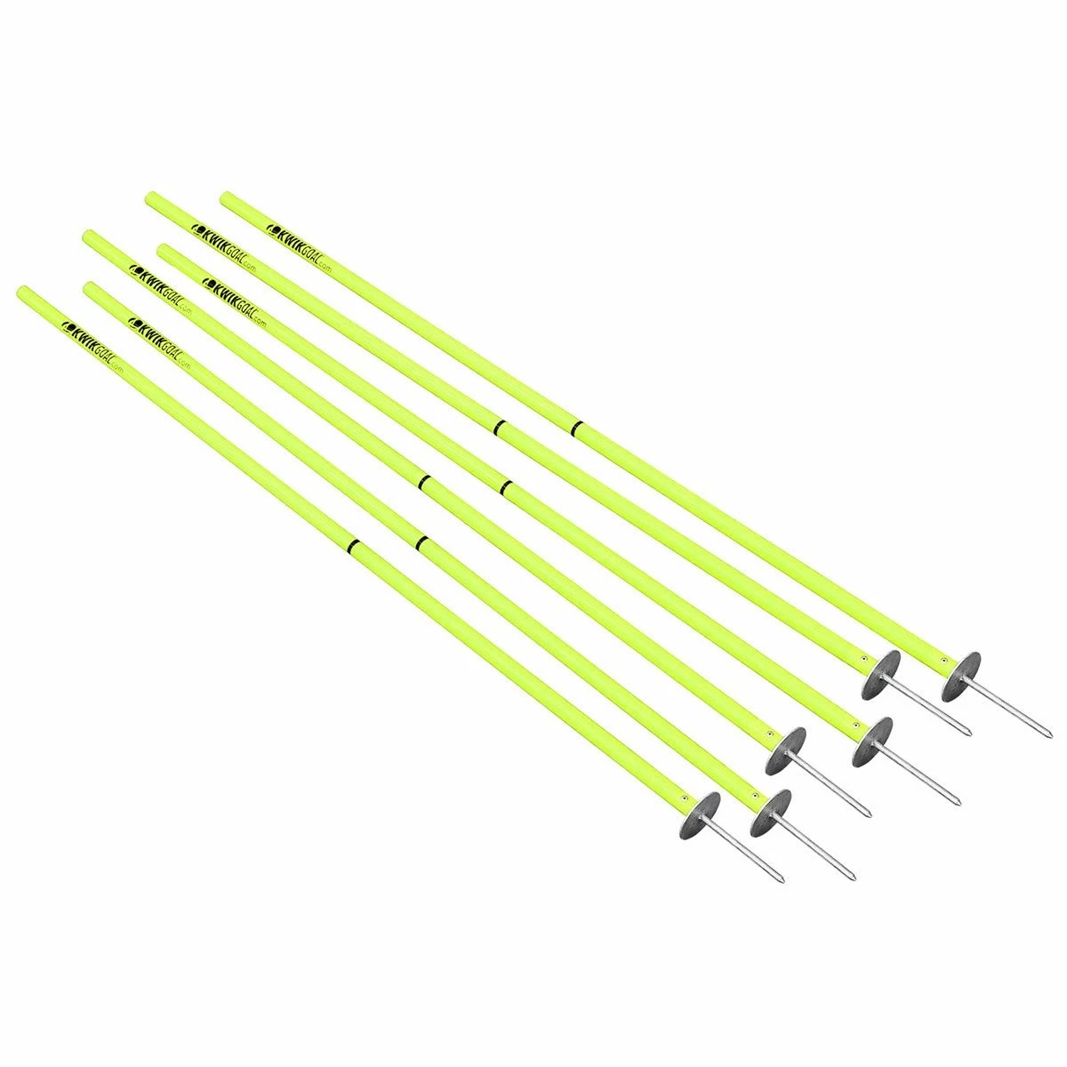 Get your practice in on the fly with the Kwik Goal Soccer Coaching Sticks 2 Go. Sticks 2 Go coaching sticks are designed for easy breakdown and include a mesh carry bag for the ultimate in portability. This set of 6 collapsible coaching sticks are perfect to help increase a player’s foot speed, ball control, and much more. These high-impact plastic coaching sticks go into the ground with a ground peg which is made for natural-surfaces. Sticks 2 Go are available in 2 colors: hi-vis orange, and hi-vis green. Improve your skills anywhere with the Sticks 2 Go coaching sticks.