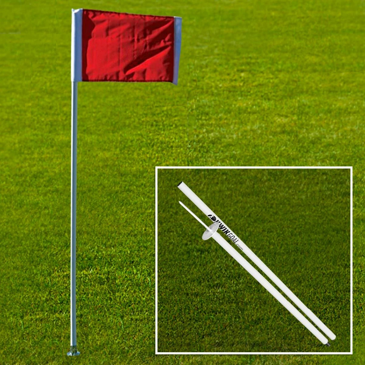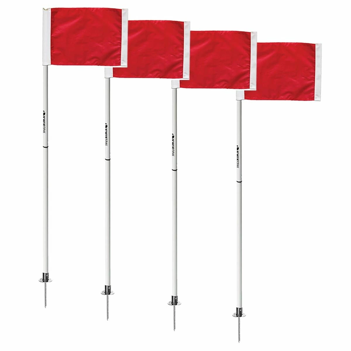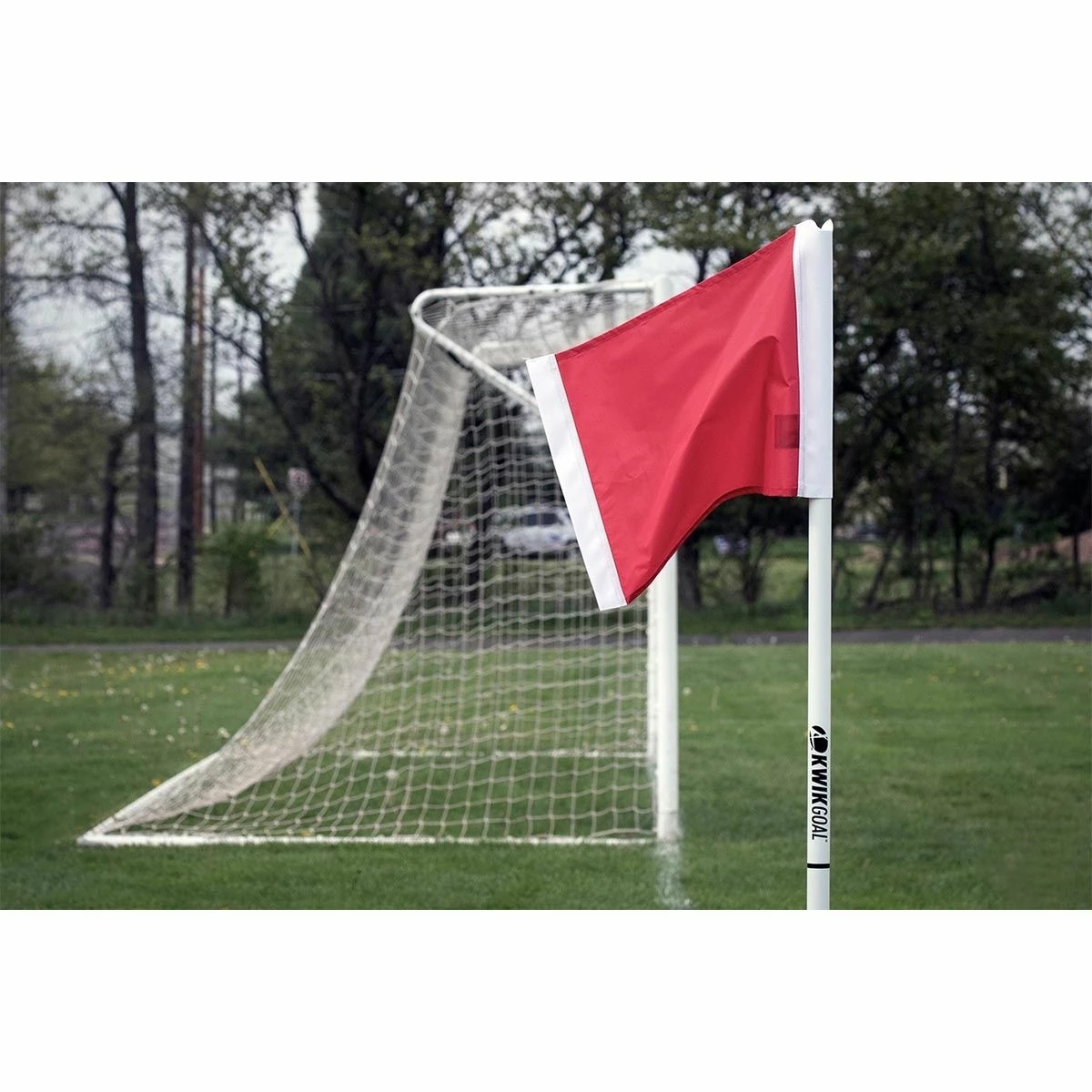 Designed for portability, these Kwik Goal Official Corner Flags 2 Go (sold in sets of 4) disassemble at the half way point of the pole and come complete with a carry bag for easy transport. Each corner flag measures 60” in height when assembled and features durable 1” round high-impact plastic uprights and standard red colored flags. These soccer corner flags are equipped with sturdy round steel bases and steel ground pegs for easy installation and are approved for play in high school (NFHS) and college (NCAA).