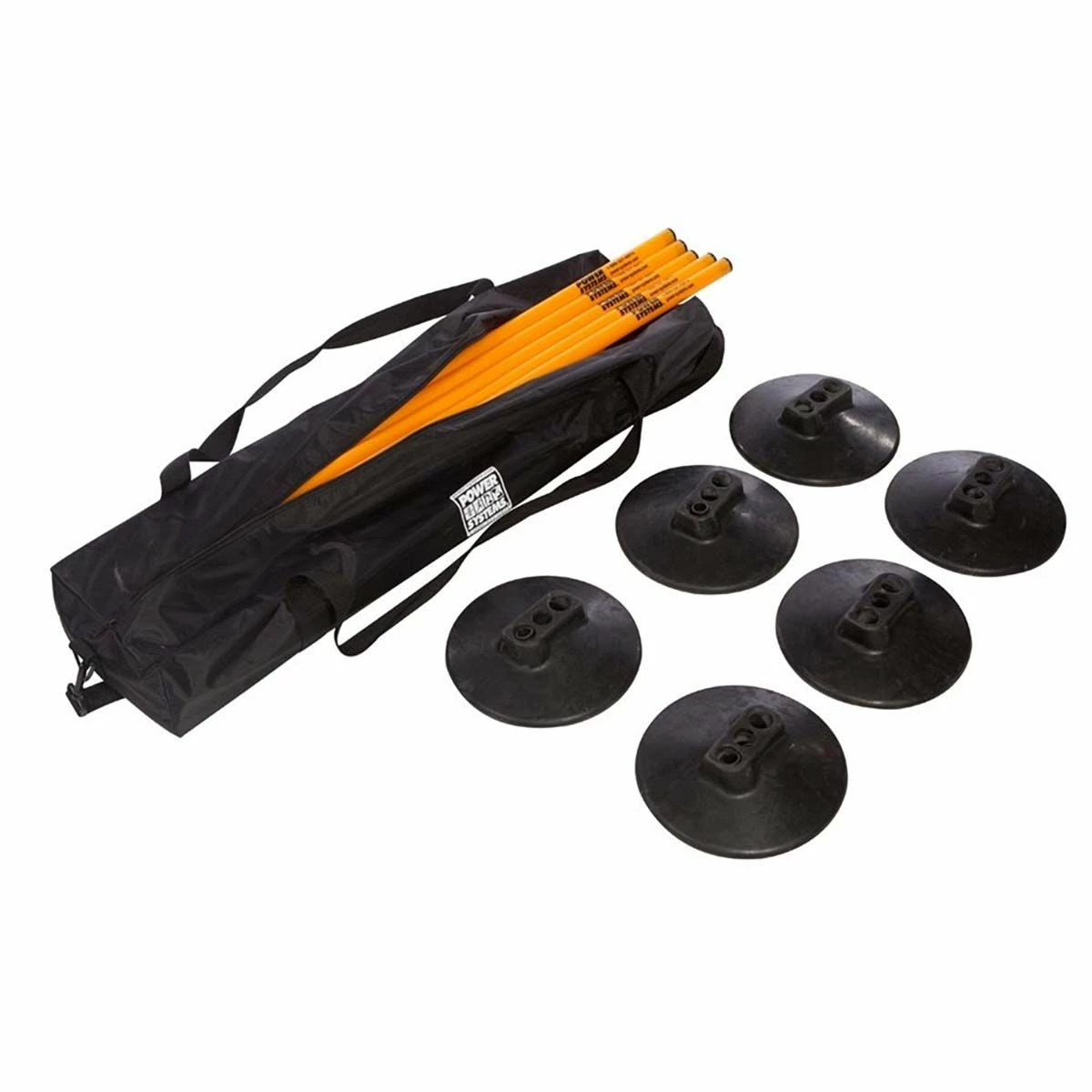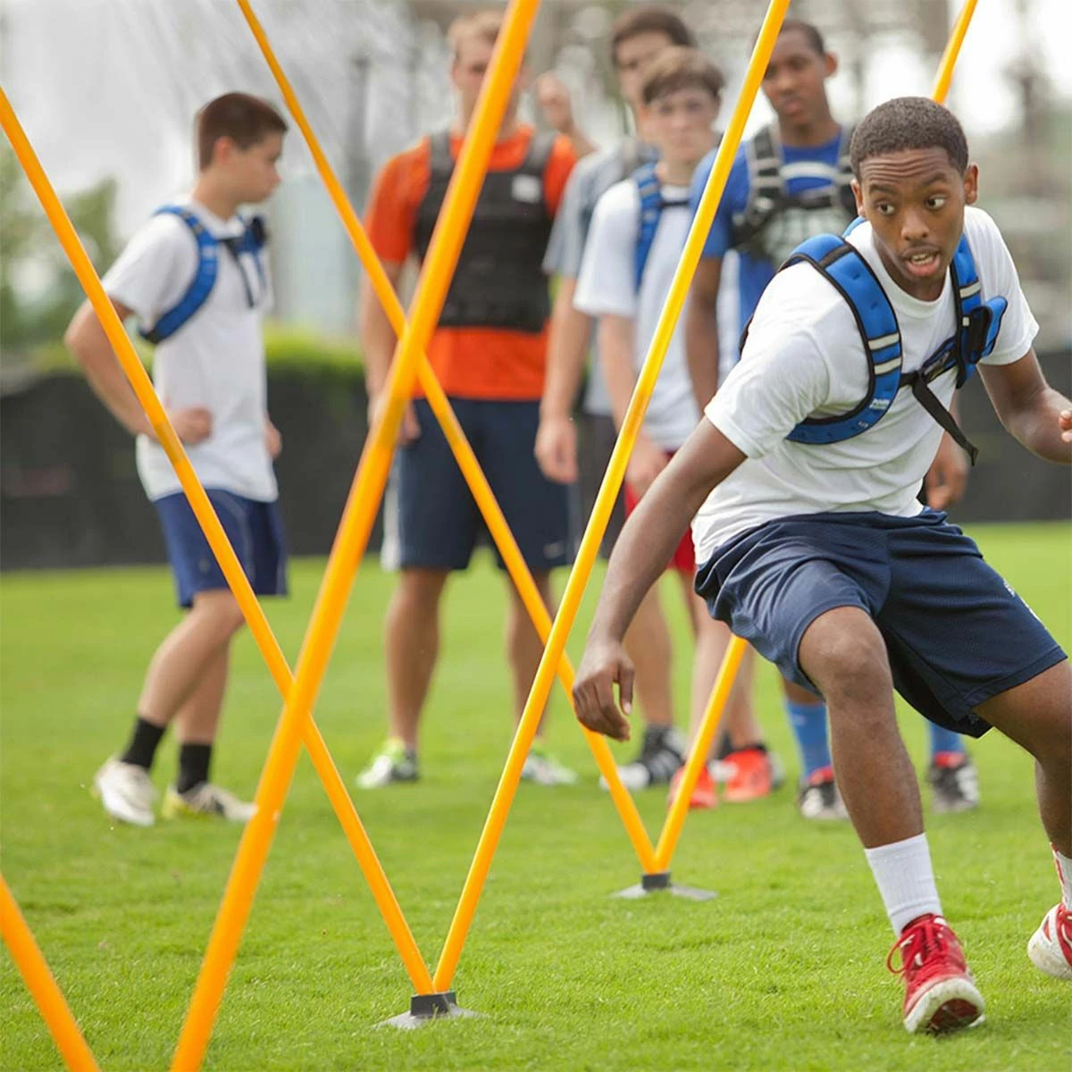 Prompt athletes to make quick, deliberate cuts while still being in position to make a play. Pro agility poles require athletes to maintain an athletic position while maneuvering. The unique molded rubber bases stabilize the poles and have 3 openings for setting the poles either vertically or diagonally. The bases allow for use on grass or turf. The yellow, high impact PVC poles can be set for a variety of drills. This set includes 6 bases, 12 pole units and a convenient carry bag.