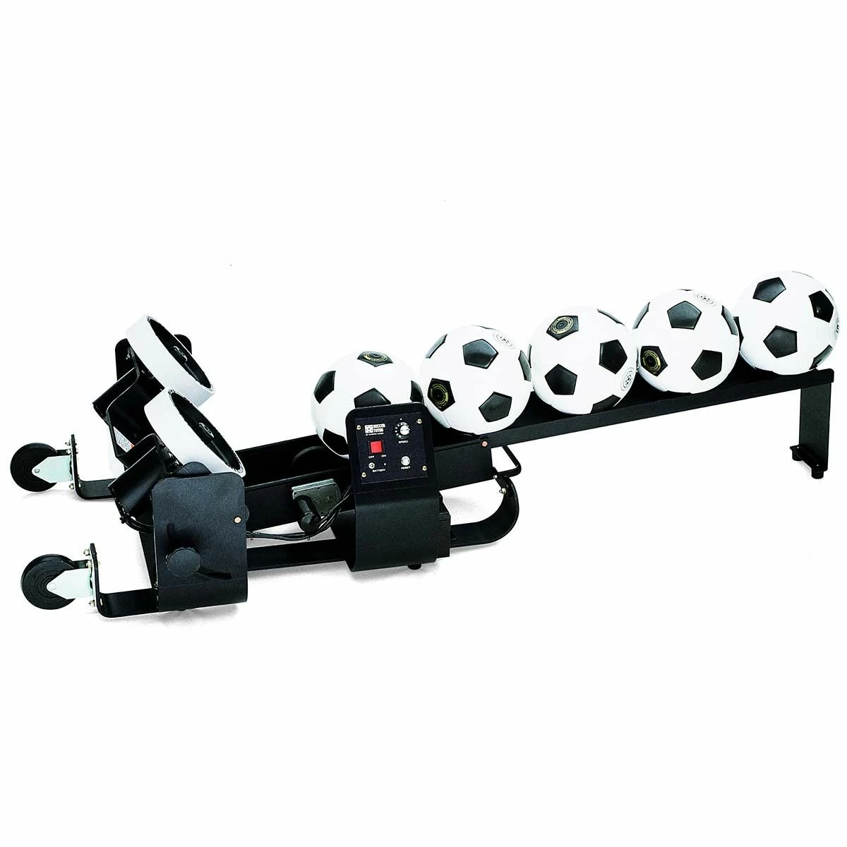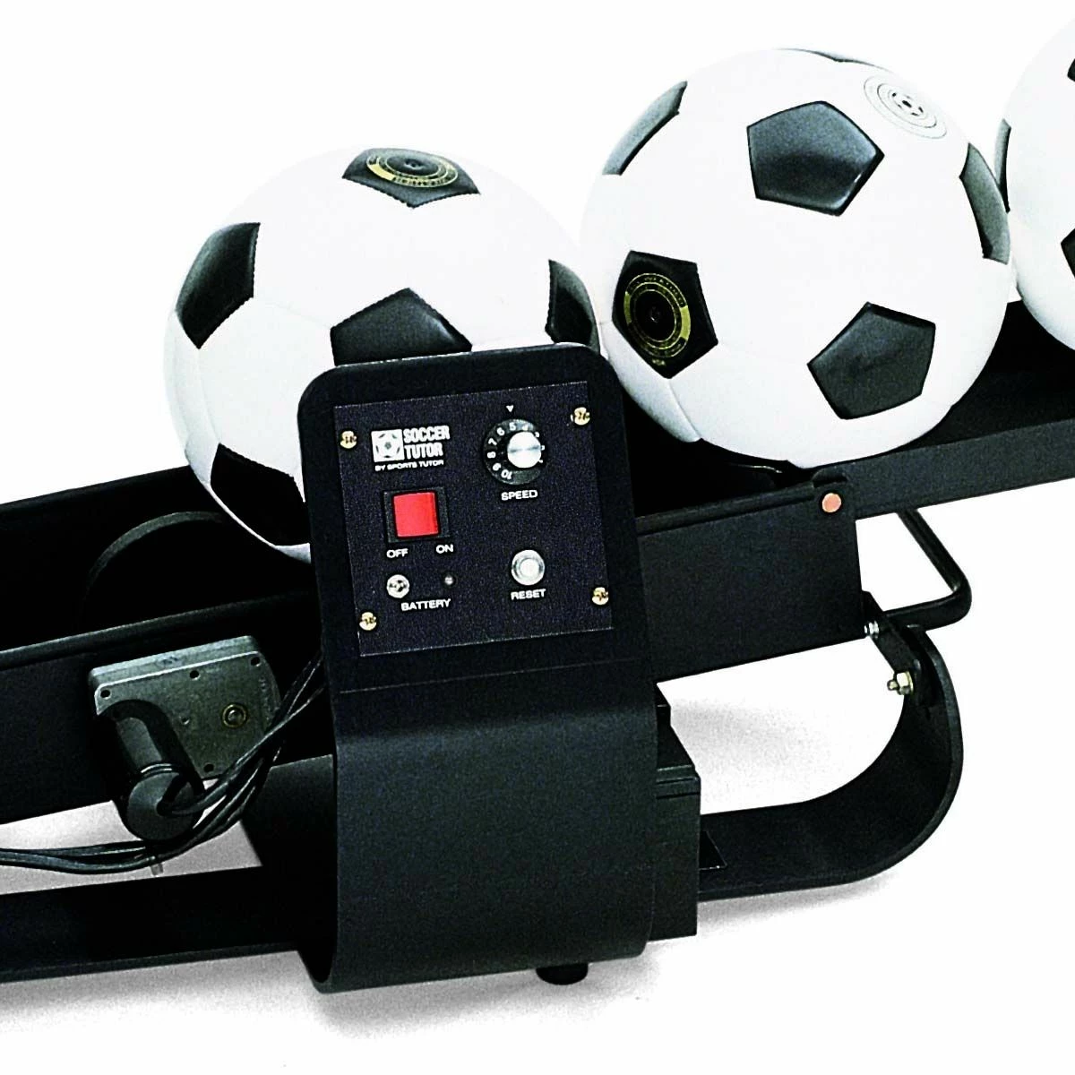 With its fold-out ball track, the Pro Trainer Soccer Tutor can automatically feed up to five balls at a time at five second intervals. This frees a coach or player from being the designated ball feeder. It also makes it possible for players to practice on their own, either on the playing field or even at home in the backyard. An optional foot-operated remote control allows a coach to start and stop the ball delivery from up to 40 feet away. The Pro Trainer Model has an extended elevation range that can serve soccer balls at angles approaching vertical (versus about 45 degrees for the Gold Model), which is ideal for close-in ball control drills.