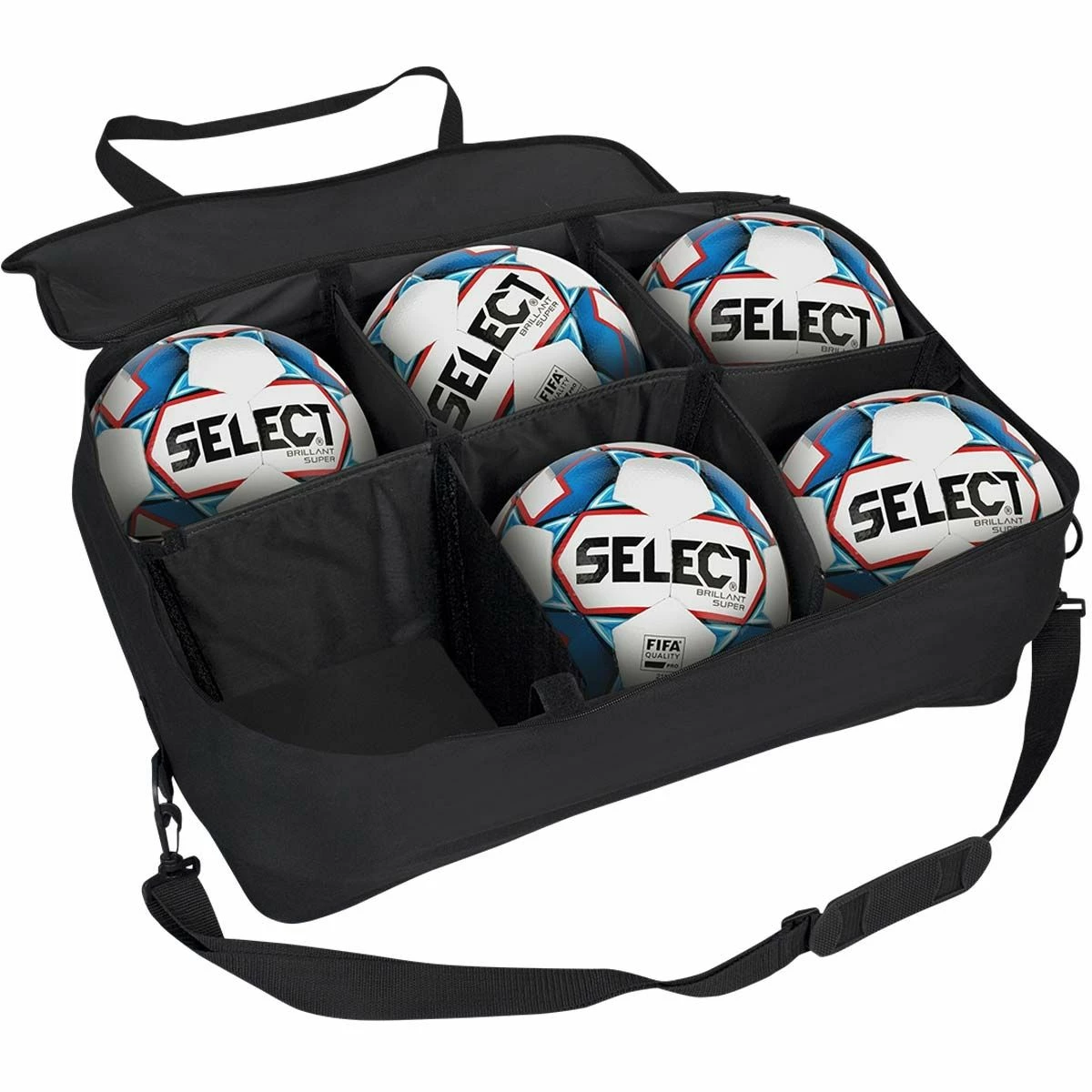 The Select 6 Ball soccer bag holds 6 futsal balls or 5 soccer balls. This practical match ball bag includes a shoulder strap and 6-ball divider. The bag is equipped with a convenient outside zippered pocket that is big enough for papers, a scorebook, or a coaching board. Comes in black as shown.