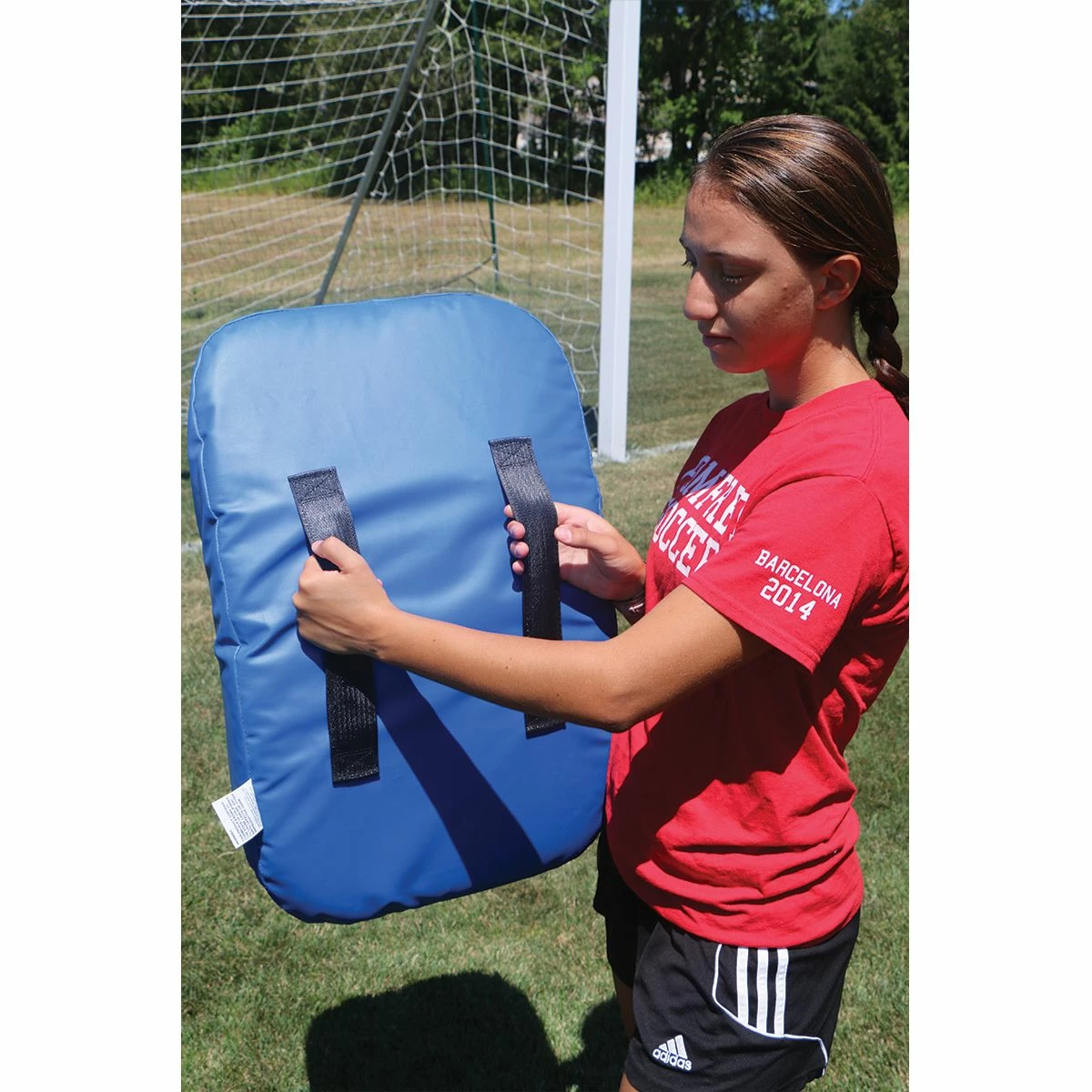 The soccer goalkeeper body shield is a great way to teach goalkeepers proper technique with body contact without the fear or risk of injury. Use for corner kicks or other set pieces. The durable foam shield is covered with heavy duty vinyl that is used for football blocking dummies so it will last for years. Two handles on the back allow the coach or “attacking player” to hold the shield and bump the keeper during drills.