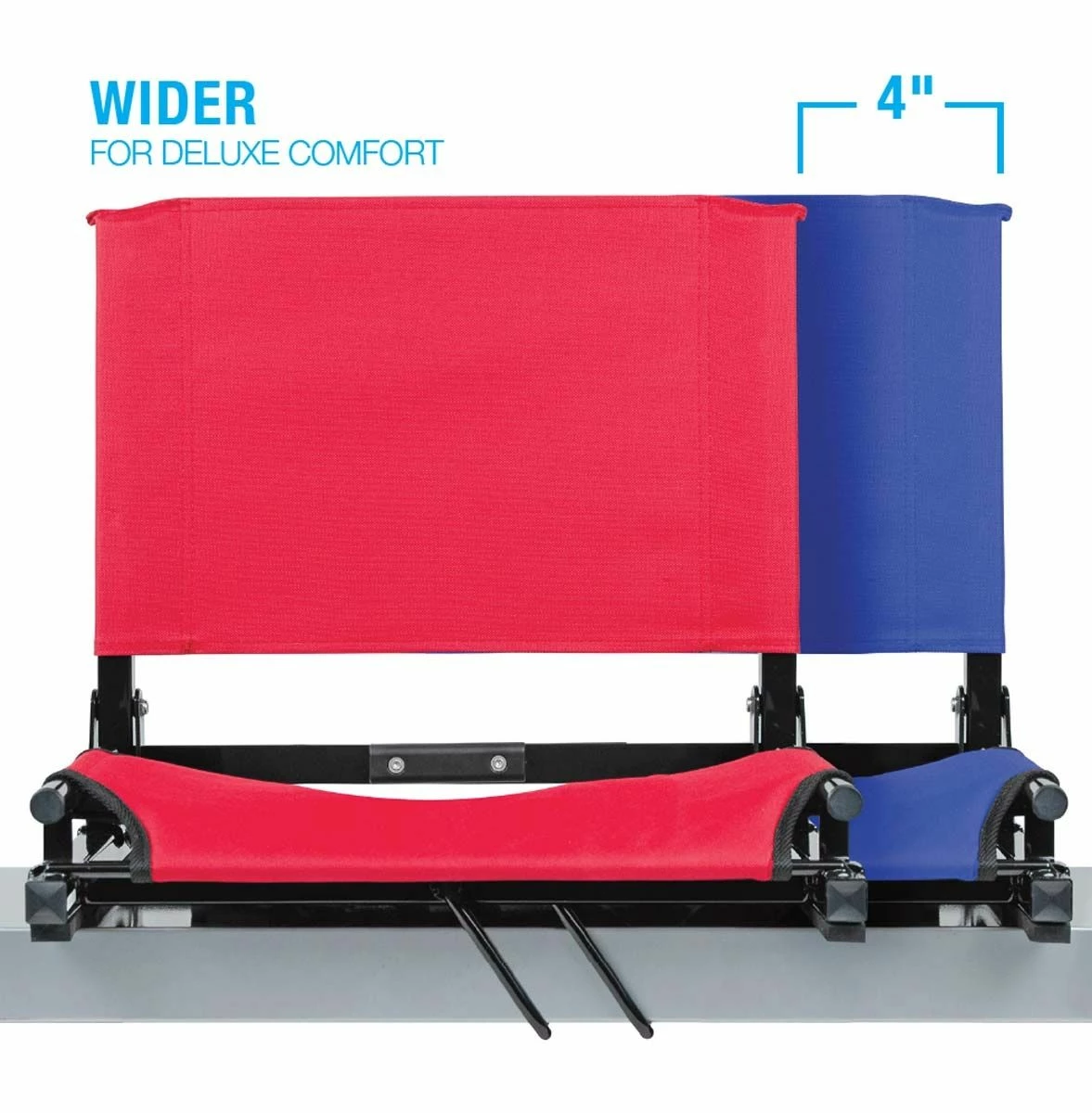 The DELUXE Stadium Chair features an extra 4″ of width for additional comfort for larger fans. Soften the hardest bleachers and show your school colors. The Stadium Chair features patented bungee-cord cushioning, durable steel-frame construction and tough Cordova canvas which makes it the best seat in the house! The two-piece stitched back is removable for easy screening or embroidery! Raise money for your team with the Stadium Chair – sponsor logos can be imprinted on either side!